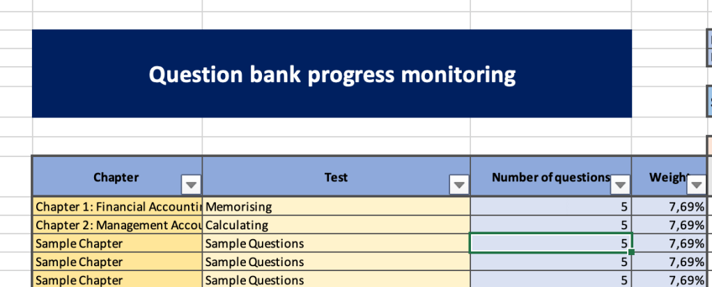 I’ve prepared this tool to monitor my progress through the question banks of my exams and I’d like to share it with you so that it can assist you with your studies. The idea of this tool is simple. It can help you monitor your progress when answering questions. It has been based on CIMA exams and how their questions bank work, but it can be applied to any type of multiple choice test. Please, share it to whom it might be of use.