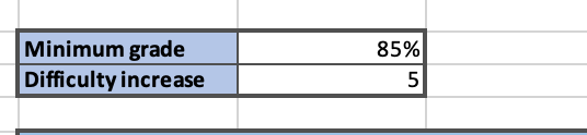 On the right hand side you have two cells where you can adjust the minimum grade to “pass¨ and the difficulty increase. In the example below, if the test has 6 questions, the maximum number of questions that will show is 5. When you answer correctly 85% of the questions, the difficulty level will increase by adding 5 more questions until the limit is reached. That means in our example that if the test has 6 questions, the maximum number of questions will be 6.