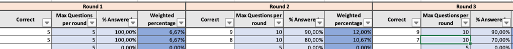 - % of answered questions: shows all the correct questions of that round.