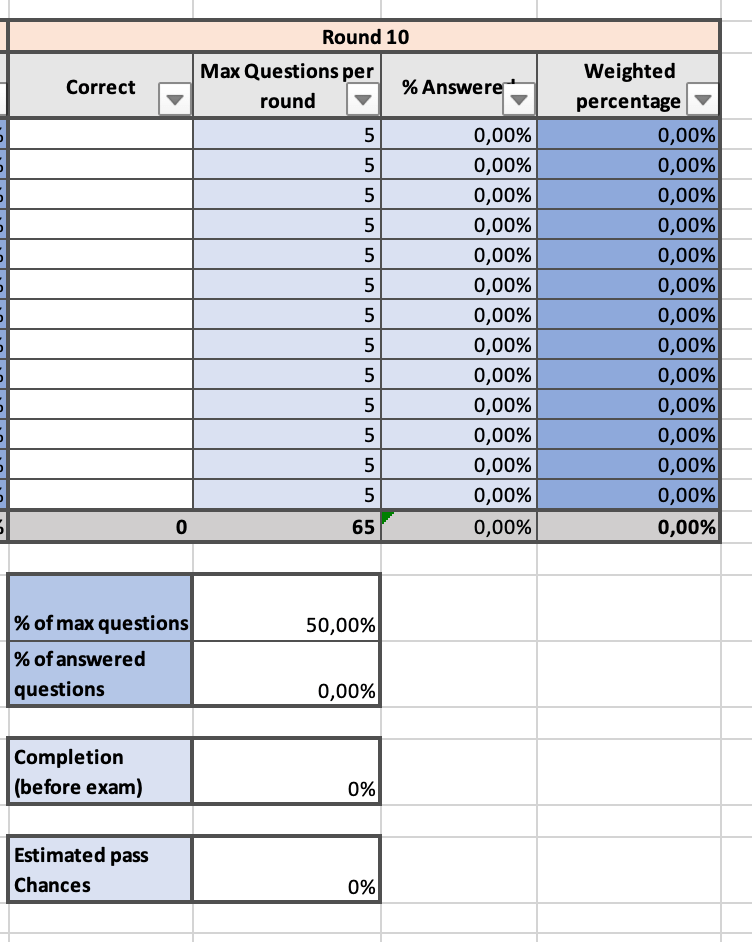 After each attempt you fill in the blank columns (the ones named ‘Correct’) the number of correct questions. If you scored the minimum grade, the next round will add these additional questions.